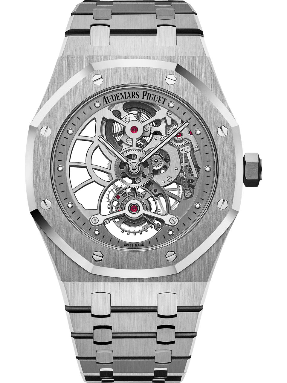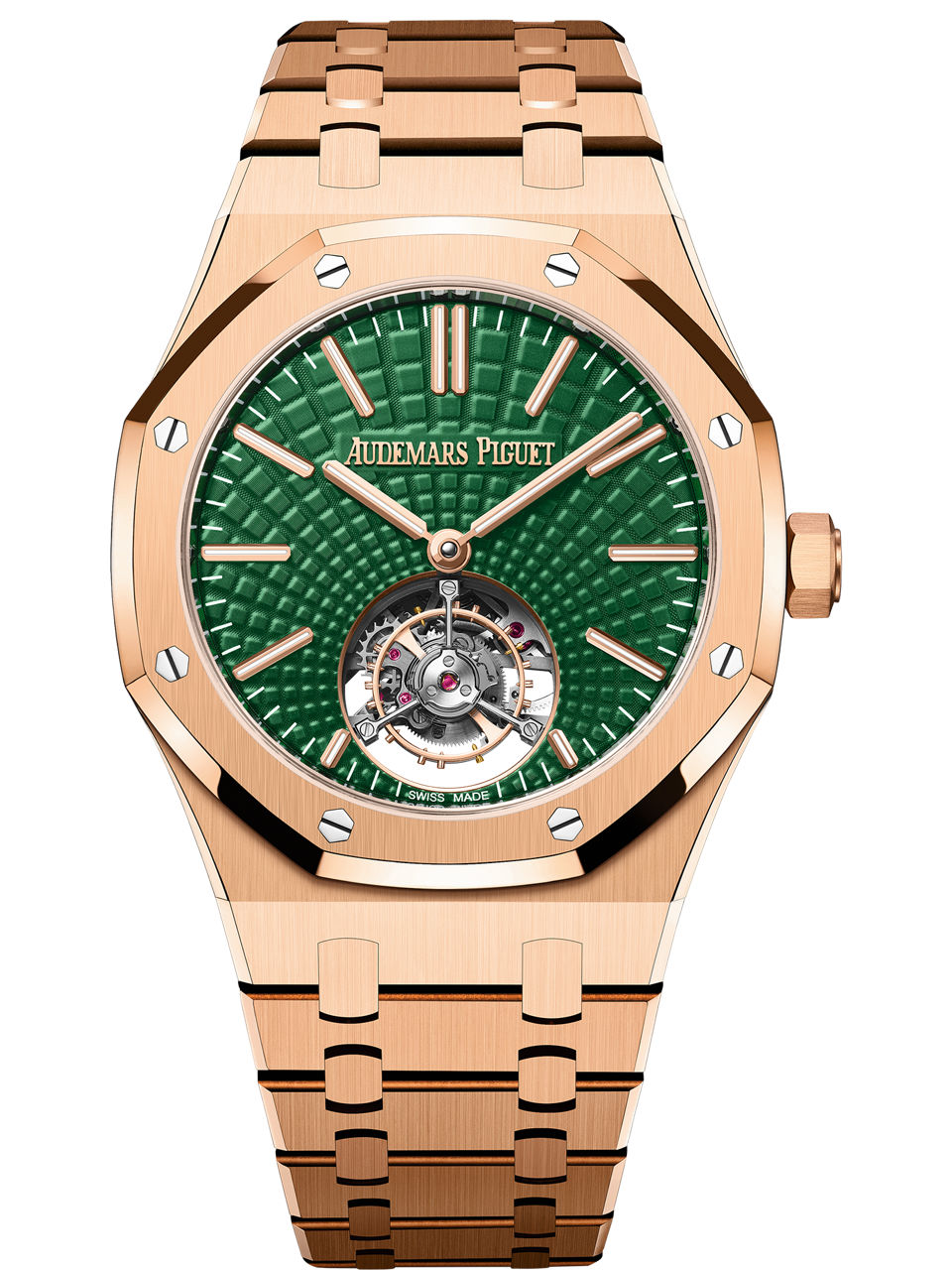 The Royal Oak’s green sunburst Tapisserie dial evolving from the Flying Tourbillon cage strengthens the elegant hues of the 18-carat pink gold case and bracelet. Green dial with “Evolutive Tapisserie” pattern, pink gold applied hour-markers and Royal Oak hands with luminescent coating Green dial with “Evolutive Tapisserie” pattern, pink gold applied hour-markers and Royal Oak hands with luminescent coating