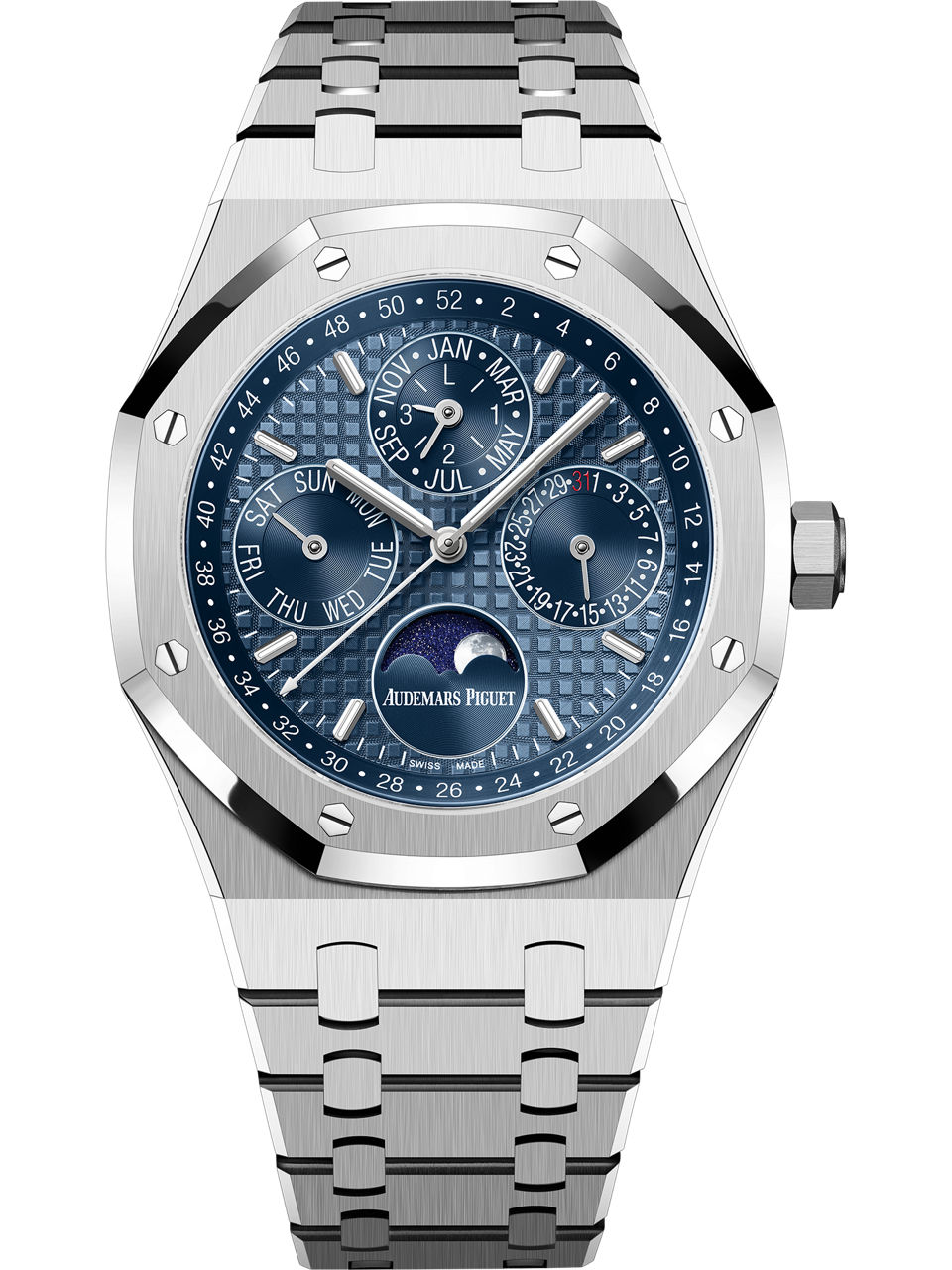 The Royal Oak Perpetual Calendar in stainless steel presents a dial offering contrasting blue tones. The subdials and inner bezel adorn the iconic “Night Blue, Cloud 50” hue of the original Royal Oak. Stainless steel case, glareproofed sapphire crystal and caseback Blue dial with “Grande Tapisserie” pattern, blue counters, white gold applied hour-markers and Royal Oak hands with luminescent coating, blue inner bezel