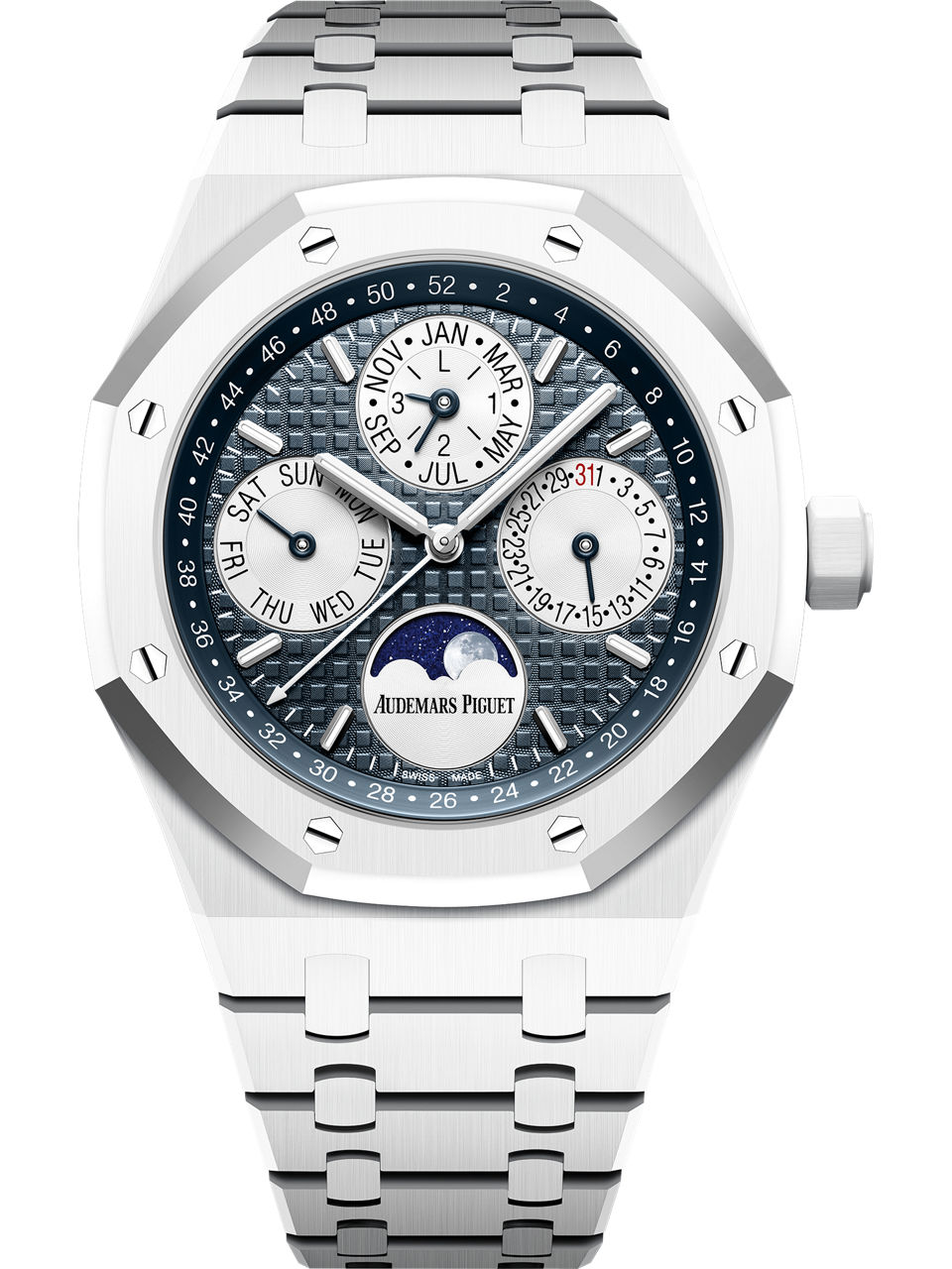 Crafted in hand-finished white ceramic, this Royal Oak Perpetual Calendar features day, date, month, astronomical moon, and week of the year. The leap year indication — pioneered by Audemars Piguet in 1955 — is also featured on the “Grande Tapisserie” decorated dial. White ceramic case, glareproofed sapphire crystal and caseback, screw-locked crown, water-resistant to 20m. Blue dial with “Grande Tapisserie” pattern, silver-toned counters, white gold applied hour-markers and Royal Oak hands with luminescent coating, blue inner bezel.