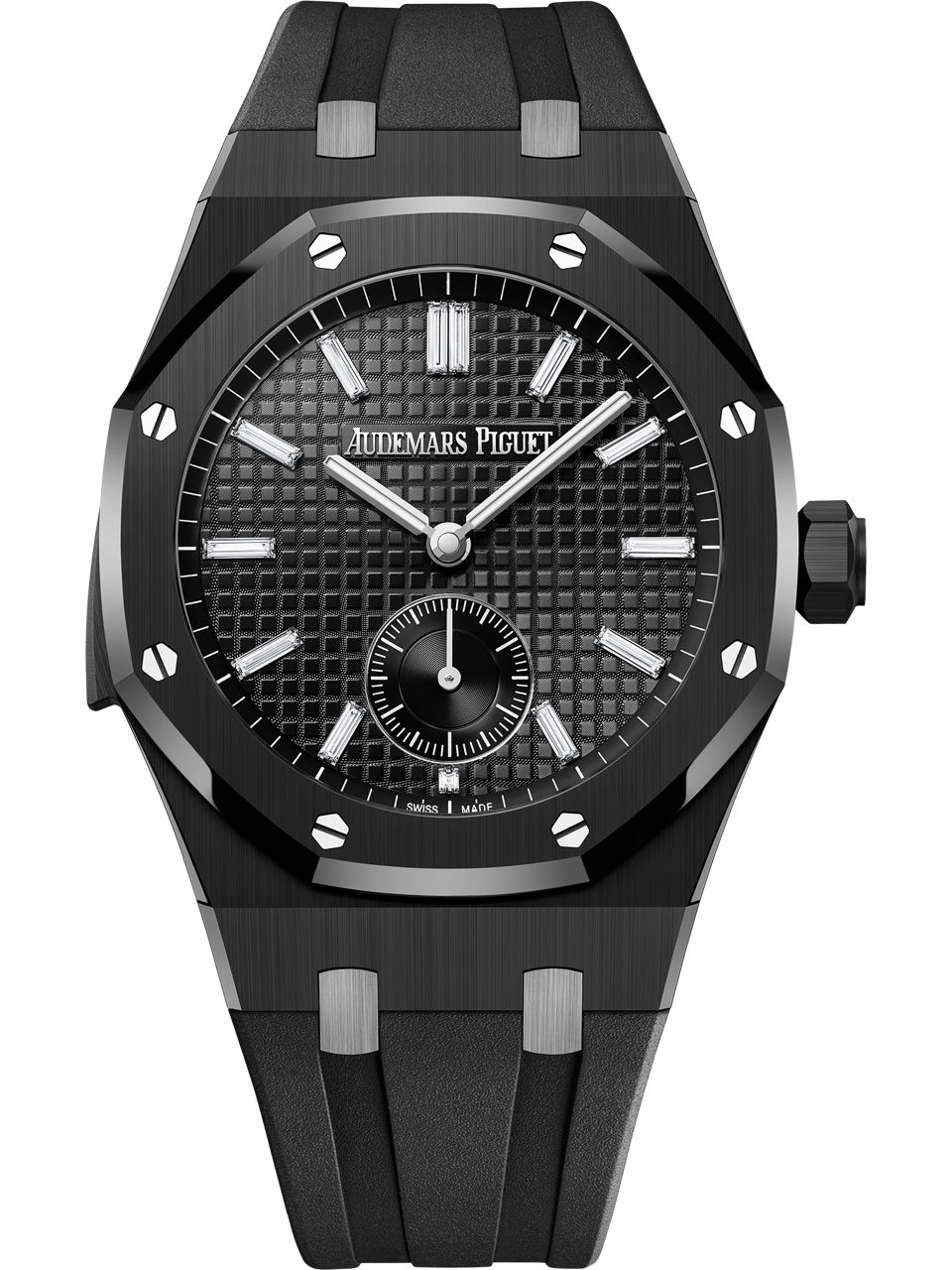 The 42mm black ceramic case plays host to a Minute Repeater Supersonnerie, while the "Grande Tapisserie" dial is enriched with baguette-cut diamond hour markers. Black ceramic case, glareproofed sapphire crystal, screw-locked crown. Black dial with “Grande Tapisserie” pattern, 13 baguette-cut diamond hour-markers and white gold Royal Oak hands with luminescent coating.