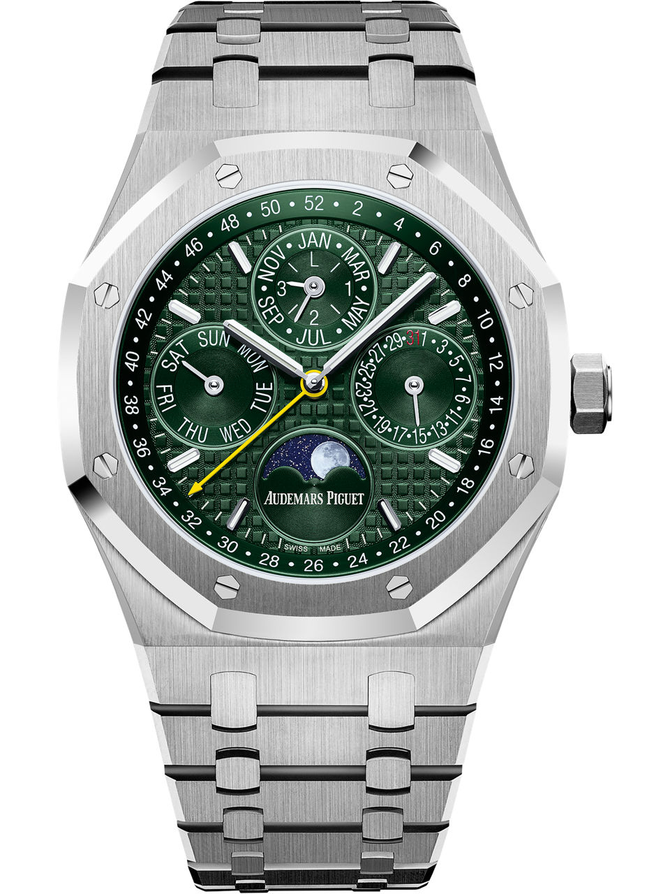 New version of the Royal Oak Perpetual Calendar in stainless steel, featuring a green dial with "Grande Tapisserie" pattern. A limited edition of 50 pieces made for the Retailer Unique Timepieces. Stainless steel case, glareproofed sapphire crystal and caseback, screw-locked crown. Green dial with “Grande Tapisserie” pattern, green counters, white gold applied hour-markers and Royal Oak hands with luminescent coating, green inner bezel.