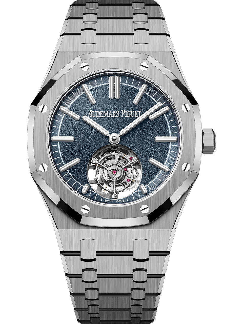 This Selfwinding Flying Tourbillon, which benefits from the new Royal Oak design evolution, combines a titanium case and bracelet with a sandblasted smoked blue dial. The sapphire caseback reveals the "50-years" oscillating weight. Titanium case, glareproofed sapphire crystal and caseback, screw-locked crown. Sandblasted smoked blue dial, white gold applied hour-markers and Royal Oak hands with luminescent coating.