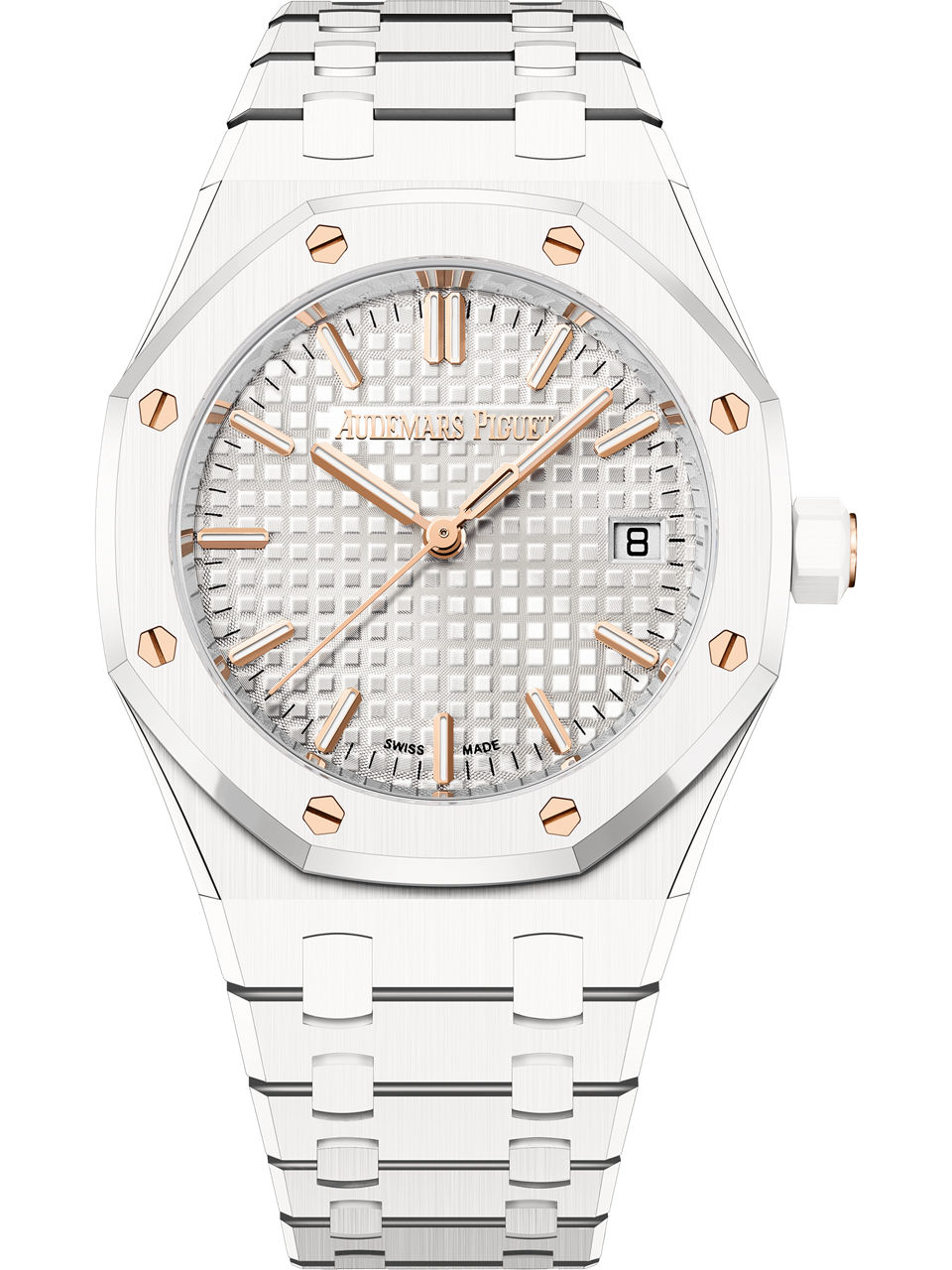 The introduction of white ceramic into this 34 mm Royal Oak, along with the addition of a silver-toned "Grande Tapisserie" dial and pink gold accent, adds a touch of glamour to this iconic timepiece. White ceramic case, glareproofed sapphire crystal and pink gold caseback. Silver-toned dial with “Grande Tapisserie” pattern, pink gold applied hour-markers and Royal Oak hands with luminescent coating.