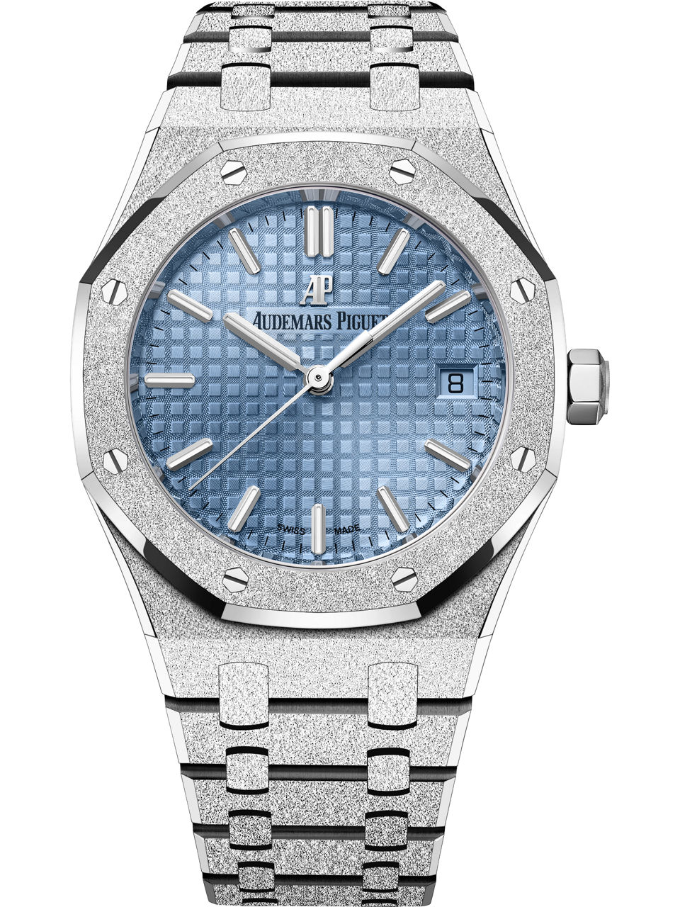 The 18-carat white gold Royal Oak Selfwinding in 34 mm shimmers with Frosted Gold, while the light blue Tapisserie dial offers an interesting play of light. Hammered 18-carat white gold case, glareproofed sapphire crystal and caseback Light blue dial with “Grande Tapisserie” pattern, white gold applied hour-markers and Royal Oak hands with luminescent coating