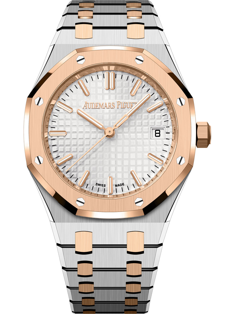 Endowed with the new design evolution, this 34 mm anniversary timepiece presents a two-tone case and bracelet marrying stainless steel and 18-carat pink gold, a silver-toned dial and a rhodium-toned “50-years” oscillating weight. Stainless steel case and 18-carat pink gold bezel, glareproofed sapphire crystal and caseback. Silver-toned dial with “Grande Tapisserie” pattern, pink gold applied hour-markers and Royal Oak hands with luminescent coating.