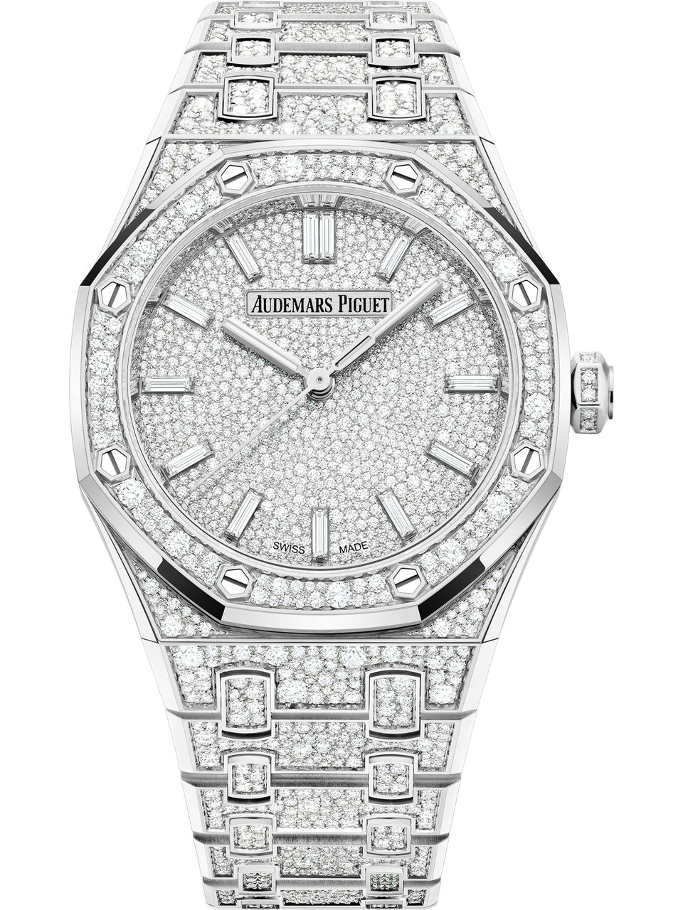 White gold and snow-set brilliant-cut diamonds imbue this 34 mm model with a wintry appearance, while 13 baguette-cut diamond hour markers serve to heighten the frost-themed look. 18-carat white gold case snow-set with brilliant-cut diamonds, crown set with brilliant-cut diamonds, bezel snow-set with brilliant-cut diamonds, glareproofed sapphire crystal and caseback. 18-carat white gold dial snow-set with brilliant-cut diamonds, baguette-cut diamond hour-markers, white gold Royal Oak hands with luminescent coating.