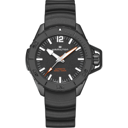 Water resistant up to 100 bar (1,000 m) and equipped with a helium escape valve, the Khaki BeLOWZERO is perfect for even the most daring of deep water adventures. The convex sapphire crystal offers high-performance protection during underwater exploration and its bright yellow rubber strap, paired with a 46mm brushed titanium case make it reminiscent of the bulk of a yellow submarine. This Hamilton is a nautical classic designed for marine pioneers. A three-hand movement with or without a date function and boasting a superior power reserve of 80 hours, the H-10 appears with intricate contrasting snail and pearled patterns for the American Classic models it drives and streamlined surfaces for the pilots’ watches.